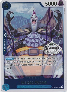 Doflamingo is a 3 cost 4000 power character with blocker and "[Blocker] (After your opponent declares an attack, you may rest this card to make it the new target of the attack.) [On Play] Look at 5 cards from the top of your deck and place them at the top or bottom of the deck in any order.". This ability allows you to stack the top of your deck to align your draws and properly set your leader up to maximize his ability to play from the top of your deck, or you can just pitch the entire 5 cards to the bottom of your deck if you don't have need for them at this time. But let's go over Gecko Moria real fast since we did mention him previously.