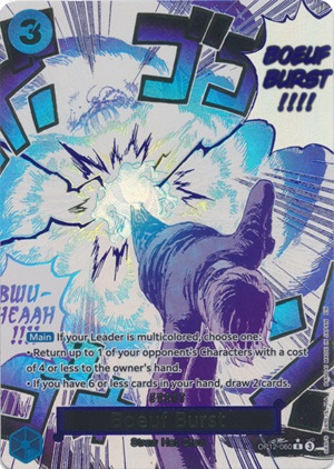 Let's start with what I think is the best event for Sanji, Boeuf Burst. Boeuf Burst is a 3-cost event that reads "[Main] If your leader is multicolored choose one: Return up to 1 of your opponent's characters with a cost of 4 or less to the owner's hand OR If you have 6 or less cards in your hand, draw 2 cards." Sanji wants to be able to shift through the deck to try and find the pieces you need against specific matchups, but this event is not leader locked to just Sanji and you can play it with any multicolored leader touching Blue. This card lets you straight up return something to your opponent's hand, say a low cost blocker so you can guarantee to get a hit in, so it's nothing but gas as far as I am concerned.