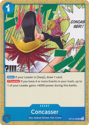 Another event worth taking note of is Concasser. Concasser is fairly straightforward; a one cost event that reads "[Main] If your Leader is 'Sanji', draw 1 card." and "[Counter] If you have 4 or more events in your trash, up to 1 of your leaders gains +4000 power during this battle." So, while this event's isn't fully restricted to Sanji decks, the counter is definitely best with Blue/Purple Sanji leader by benefitting from having 4 or more event cards in your trash.