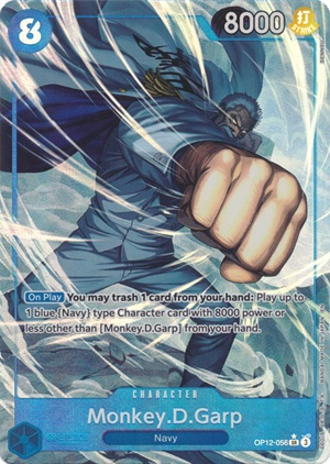Monkey .D. Garp is an 8-cost 8000 power character with "[On Play] You may trash 1 card from your hand: Play up to one Blue 'Navy' type character card with 8000 power or less other than 'Monkey.D.Garp' from your hand." So, for the grand cost of 8 DON!! you could play out yet ANOTHER Kuzan from Garp's ability, really tapping down one opposing characters and ensuring they dont swing in for damage any time soon. There are other characters you can also play off Garp but I'll leave the hunt for those up to you.