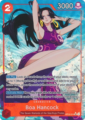 Boa Hancock is a 2-cost 3000 power character with two separate abilities. Her first ability is "[On Play] Look at 5 cards from the top of your deck; reveal up to 1 [Monkey.D.Luffy] or red Event and add it to your hand. Then, place the rest at the bottom of your deck in any order." Her second ability: "[Activate:main] You may trash this character: Give up to 2 rested DON!! cards to your Leader or 1 of your Characters."