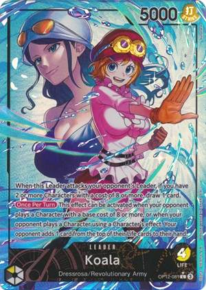 Carrying on down the list of leaders from this set, we have Koala (081). Koala (081) is a Black/Yellow leader with the standard stats for a multicolored leader of 5000 power and 4 life. Much like Silvers Rayleigh, Koala also has a static ability, but hers is "When this Leader attacks your opponent's Leader, if you have 2 or more characters with a cost of 8 or more, draw 1 card." Koala's leader ability is: "[Once Per Turn] this effect can be activated when your opponent plays a character with a base cost of 8 or more, or when your opponent plays a character using a character's effect. Your opponent adds 1 card from the top of their life cards to their hand."