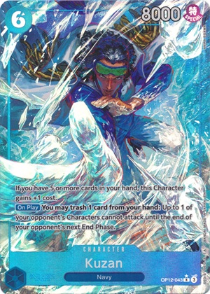 Kuzan is a 6-cost 8000 power character with a static ability of "If you have 5 or more cards in your hand, this character gain +1 cost." and the ability "[On play] You may trash 1 card from your hand: up to 1 of your opponent's characters cannot attack until the end of your opponent's next End Phase."