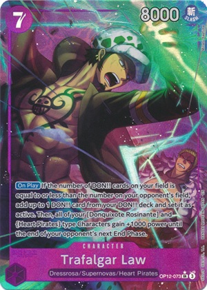 Second, let's take a look at the purple Trafalgar Law character coming out of this set. Trafalgar Law is a 7-cost 8000 power character with the following ability "[On Play] If the number of DON!! cards on your field is equal to or less than the number on your opponent's field, add up to 1 DON!! card from your DON!! deck and set is as active. Then, all of your 'Donquixote Rosinante' and 'Heart Pirates' type characters gain +1000 power until the end of your opponent's next End Phase." This character, like most things in Purple, does rely on the amount of DON!! On your field as opposed to your opponent, but allows you to ramp more DON!! onto the field and buffs characters that would in most cases remain relevant to DonQuixote Rosinante leader.