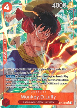 Monkey.D.Luffy is a 4-cost 4000 power character with +1000 counter; he has the static ability of "If you have a total of 2 or more given DON!! Cards, this Character gains +2000 power." and the ability "[On Play] You may reveal 2 events from your hand: Play up to 1 red Character card with 3000 power or less from your hand. Then, give up to 1 rested DON! card to your Leader or 1 of your characters." In Theory, you could also play a Boa Hancok off this Monkey .D. Luffy for a bigger buff on your board. Both of these characters support a Red Deck Wins blitz toward victory with Silvers Rayleigh.