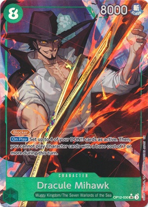 Mihawk is an 8-cost 8000 power character with "Blocker" and "[On Play] Set up to 4 of your DON!! cards as active. Then, you cannot play character cards with a base cost of 7 or more during this turn." This ability essentially makes Mihawk a 4-cost 8000 power blocker that allows you to repurpose your DON!! to either get a cheaper character out or utilize the re-activated DON!! for a more aggressive purpose.