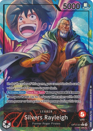 Silvers Rayleigh (001) represents a to-the-letter, text book definition of a "Red Deck Wins" (RDW) leader: cheap costs, fast damage, and draining your opponents' life quickly. The only issue is you need to win fast or not at all. A few good support pieces for this leader from this set are Monkey.D.Luffy (015) and Boa Hancock (014).