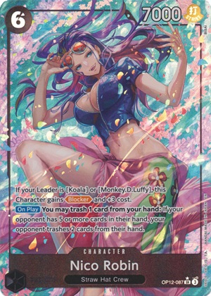 Nico Robin is a 6 cost character with 7000 power and a static ability of "If you leader is [Koala] or [Monkey.D.Luffy], this character gains [Blocker] and +3 cost." The plus three cost essentially makes it so Nico Robin is harder to remove from the board. Nico Robin also has the ability "[On Play] You may trash 1 card from your hand: If your opponent has 5 or more cards in their hand, your opponent trashes 2 cards from their hand." Alongside Koala, Robin isn't just a beefy blocker but also hand disruption that allows you to thin down potential counters that could stop you from chipping away at your opponent's life pile.