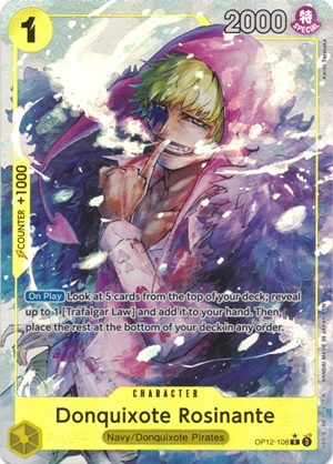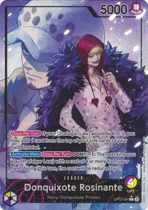 Last up on our list, and certainly the underdog of Set 12, is Donquixote Rosinante (061). Donquixote Rosinante (061) is a Yellow/Purple leader with 4 life and 5000 power with two leader abilities. The first of Rosinante's abilities is "[Once Per Turn] If your 'Trafalgar Law' would be K.O.'d, you may add 1 card from the top of your Life cards to your hand instead." and his second ability is "[Activate Main][Once Per Turn] DON!! -1: The next time you play [Trafalgar Law] with a cost of 4 or more from your hand during this turn, the cost will be reduced by 2."