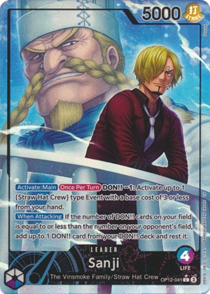 Back to the multicolor leaders, lets take a look at Sanji (041). Sanji (041) is a blue-purple leader with 5000 power and 4 life with two leader abilities. Sanji's first ability is "[Activate Main][Once Per Turn] DON!! -1: Activate up to 1 'Straw Hat crew' type event with a base cost of 3 or less from your hand," while his other ability is "[When Attacking] If the number of DON!! cards on your field is equal to or less than the number on your opponent's field, add up to 1 DON!! card from your DON!! deck and rest it." So, unlike some of the leaders we have previously discussed, Sanji seems to be much more reliant on events. Sanji also allows you to get DON!! onto your field as quickly as possible, especially if you are going first, but let's talk about Sanji's first ability by going over what event cards are available to us in Legacy of the Master.