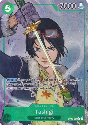 Then there's Tashigi. She is a 5-cost 7000 power character with the ability "[On Play] Rest up to 1 of your opponent's characters with a base cost of 6 or less. Then, give up to 3 rested DON!! Cards to your 'Roronoa Zoro' leader." Tashigi is nowhere near as versatile in her ability as Zoro is, given her ability only benefits Zoro leader, but she does enable him to go in for the kill on a midrange character while also immediately attaching rested DON!! onto Zoro so he can swing into the opposing pieces twice.