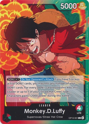 Yes, as the Main Character of the One Piece franchise, we have yet another Monkey .D. Luffy leader. This particular Luffy upholds the standard for multicolored leader statistics with 5000 power and 4 life, and has the following ability: "[DON!!x1][On Your Opponent's Attack] If you have 5 or less active DON!! cards, you may rest any number of your DON!! cards. For every DON!! Card rested this way, this Leader or up to 1 of your 'Straw Hat Crew' type characters gains +200 power during this battle."