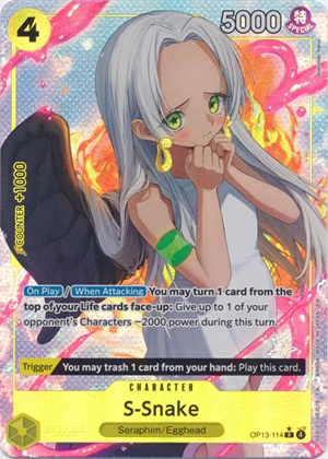 S-Snake is a 4-cost 5000 power character with +1000 counter and the following ability: "[On Play]/[When Attacking] You may turn one card from the top of your life cards face-up: Give up to 1 of your opponent's characters -2000 power during this turn." While it's dependent on the amount of cards in your life pile, this ability can potentially trigger twice and allow you to more easily remove opposing characters from the board by means of combat. S-Snake also has a trigger of "You may trash 1 card from your hand: Play this card." It's definitely a base-level threat on the battlefield but has growing potential as the game goes on, as long as she stays on the board.