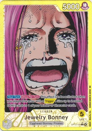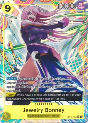 Jewelry Bonney is our only Yellow Leader in Set 13. She upholds the standard mono-color leader statistics of 5000 power and 5 life and has the following ability: "[Your Turn][Once Per Turn] This effect can be activated when you play a character with a trigger. Give up to 2 rested DON!! Cards to 1 of your Leader or Character cards." Jewelry Bonney has an ability that relies on you playing with cards with trigger, but outside of that there is no other limitation to this leader. Play Characters, buff your characters. While there aren't a whole lot of Bonney Pirates cards for Bonney to synergize with, there are a fair amount of cards that synergize with the "Egghead" subtype. Let's go over some support characters that belong within a Jewelry Bonney deck from this set.