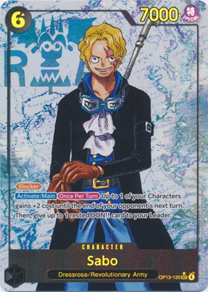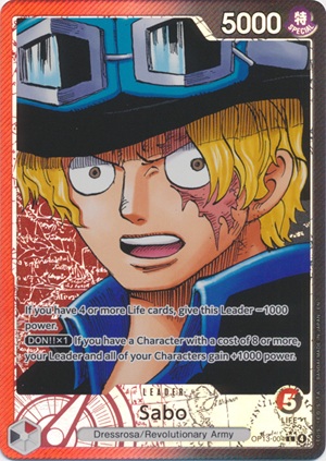 Sabo is a Red and Black leader with irregular statistics for a multicolored leader at 5000 power and 5 life. Sabo has a static ability of "If you have 4 or more life cards, give this Leader -1000 power," in addition to his leader ability "[DON!!x1] If you have a character with a cost of 8 or more, your Leader and all of your Characters gain +1000 power."