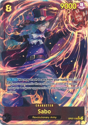 Sabo certainly brings something new to the table when it comes to Red and Black leaders. Not only does he start off with an additional life compared to most multicolored leaders, but he also brings in a way to buff your leader and other characters without needing to worry about taking a life to get back to the standard 5000 leader power. Granted, you will need to have a character with cost 8 or more on the field, so you will want to protect your life as much as possible until then. But with Sabo there is plenty of opportunity to make it to the late game. There are plenty of revolutionary cards that were printed in previous sets, such as Sabo from 500 Years in the Future and Monkey .D. Dragon from Legacy of the Master.