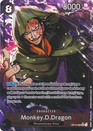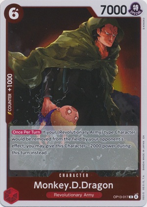 Monkey .D. Dragon is a 6-cost 7000 power leader with +1000 counter and the ability "[Once Per Turn] If your 'Revolutionary Army' type character would be removed from the field by your opponent's effect, you may give this character -2000 power during this turn instead." Monkey .D. Dragon works as protection for other Revolutionary characters while also operating as a beat stick on the field!