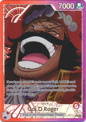 Gol .D. Roger is a Red and Purple leader with irregular stats of 7000 power and 5 life, and he has the following static leader ability: "If you have any DON!! cards on your field, 1 DON!! Card placed during your DON!! Phase is given to your leader. If you have 9 or less DON!! Cards on your field, give this leader -2000 power."