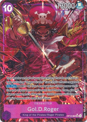 Gol .D. Roger is a 10-cost 13000 power character with the static ability "Your Leader and all of your characters that do not have a type including 'Roger Pirates' have their effects negated" and the following ability "[On Play] DON!! -3: Your Leader gains +2000 power until the end of your opponent's next end phase. Then, give all of your opponent's characters -2000 power until the end of your opponent's next End Phase." While costly at 10 DON!! total, this character still has a whooping 13000 power to swing in with on your next turn while also buffing your leader and shrinking the opposing forces. Without any form of gaining more DON!! next turn, your leader will be reduced down to 5000 power instead of 7000 with the Gol .D. Roger character ability, but I am sure there are a few ways around that.