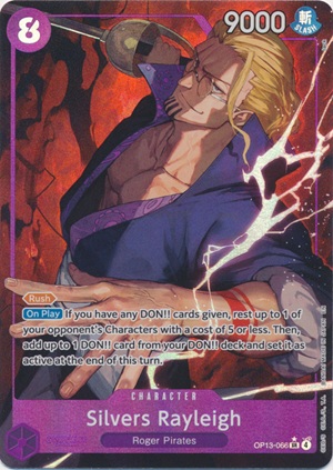 Silvers Rayleigh is a 8-cost purple character with 9000 power and Rush. He has the ability: "[On Play] If you have any DON!! cards given, rest up to 1 of your opponent's characters with a cost of 5 or less. Then, add up to 1 DON!! card from your DON!! deck and set it as active at the end of this turn." Rayleigh provides a way to get around Roger Leaders DON!! demands within his static ability while also either getting rid of a threat on your opponents board or knocking out a minimum of a 5-cost character.