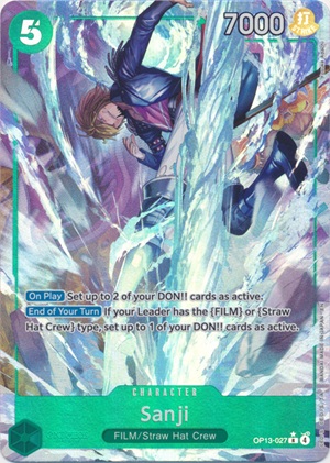 Sanji and Nico Robin both are odd cost characters that curve out well as long as you are on the play with Monkey .D. Luffy as your leader. Sanji is a 5 cost 7000 power Character, whereas Nico Robin is a 7 cost 7000 power character with a +1000 counter. Sanji has two abilities, "[On Play] Set up to 2 of your DON!! cards as active." as well as "[End of your turn] If your Leader has the [FILM] or [Straw Hat Crew] type, set up to 1 of your DON!! cards as active." Sanji enables you to ensure you have DON!! up for a counter event or simply for your own Leaders ability when he hits the field (ideally turn three) as well as unresting something on the board. Tie in the cost with the power and abilities and this Sanji should be a target that your opponent will want to get rid of.