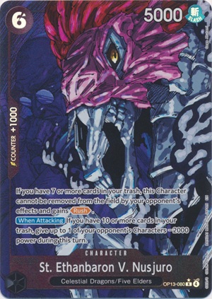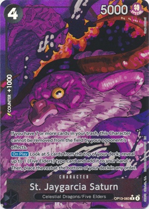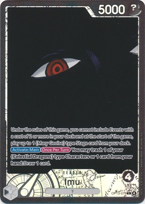 There is a lot to unpack with this leader. Imu somewhat balances himself out by starting off at 4 life and limiting the kind of events you can play within your 50-card deck. However, being able to start with a stage on the board right off the bat and also having a viable draw engine is nothing but gas. Within the current storyline of One Piece, there isn't much known about Imu, so you will notice a "?" where there would normally be an attribute in the top right hand corner as well as in the leader's sub-type.