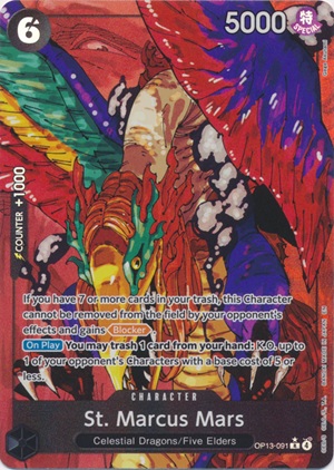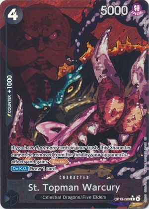 In addition to this static ability, Imu has the following leader ability "[Activate: Main][Once Per Turn] You may trash 1 of your 'Celestial Dragons' type characters or 1 card from your hand: Draw 1 card.