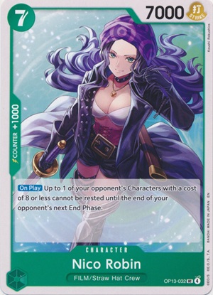 Moving on with our hypothetical turn, we can go ahead and drop Nico Robin who has the ability "[On Play] Up to 1 of your opponent's Characters with a cost of 8 or less cannot be rested until the end of your opponent's next End Phase". She's pseudo-removal, but this is a big body that ensures an opposing big body won't be swinging toward you.