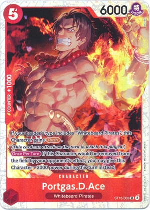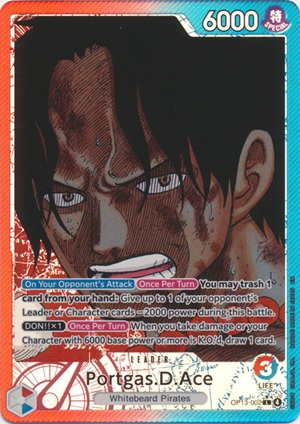 Portgas .D. Ace is a multicolored leader with irregular stats at 6000 power and 3 life. Portgas .D. Ace has the two following abilities: "[On Your Opponent's Attack][Once Per Turn] You may Trash 1 card from your hand: Give up to 1 of your opponent's Leader or Character cards -2000 power during this battle." and "[DON!!x1][Once Per Turn] When you take damage or your Character with 6000 base power or more is K.O.'d, draw 1 card."