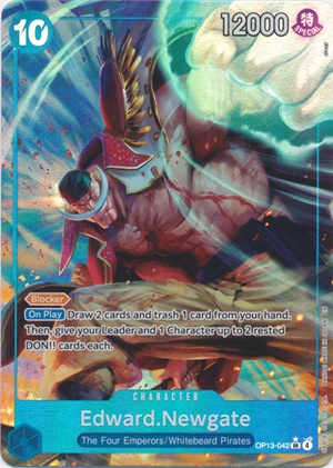 Starting off with the Captain of the Whitebeard Pirates, Edward Newgate is a 10-cost 12000 power character with Blocker and the following ability: "[On Play] Draw 2 cards and trash 1 card from your hand. Then, give your Leader and 1 Character up to 2 rested DON!! Cards each." Edward Newgate dodges abilities like the previously mentioned Nico Robin with such a huge cost while also providing a hard blocker to try and get around, on top of filling up your hand and buffing up your board. There isn't much that Edward Newgate isn't going to accomplish after he lands on the table.