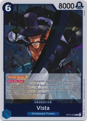 Vista is a 6-cost 8000 power character with Double Attack and the following ability: "[Once Per Turn] If this character would be K.O.'d or would be removed from the field by your opponent's effect, you may trash 1 card with a type including 'Whitebeard Pirates' from your hand instead." This is yet another Character that dodges removal at a cost, but it's one of the many within OPTCG's current cardpool. Vista is a big body that will need to be blocked or at least countered for your opponent to avoid drawing 2 from life.