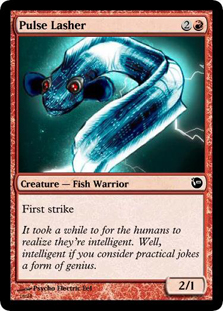 Each of the other colors felt like it had a natural fit for this setting, but red’s at a bit of a loss. Some sort of finned Goblins are always an option, but I wanted something more fitting to act as the color’s characteristic race. I considered using electric eels, but it’s important to have a sentient life form take up a color’s card slots low on the mana curve. Using animals with magical powers restricts you to a tiny range of what makes sense, whereas thinking beings can have professions and thus a wider range of effects.