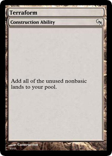 Terraform was intended to add a little bit of color fixing aid to a greedy deck or add a little bit of extra power to a consistent deck, but no matter how good it may be, it neither feels exciting nor enables any new gameplay. One option is to simply ratchet it up to the point that it allows its user not to worry about color fixing: