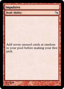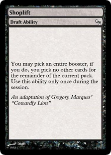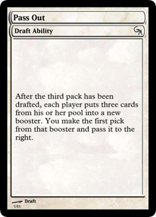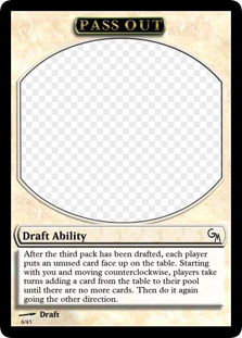 Some combination of the low-quality printer I’d used, the overly condensed text, and the general wordiness lead the drafter who received Pass Out to miss that it said to pick the cards face-up, and he immediately treated them as a booster unto themselves. What a great idea! Despite this innovation, however, the Ability proved pretty inconsequential next to some of the other effects.