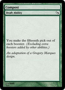 Compost works based on the same premise as Pass Out: Almost all of the cards will be good, and then it goes on to make Pass Out stronger because the drafters will have fewer late picks to throw back. I’m not sure that this card will yield the excitement I’m looking for, but Gregory’s a smart guy, so not testing an ability that he’s seen fit to use for Cube: Legacy is not only foolish, but a disservice to the people drafting with my setup.