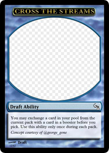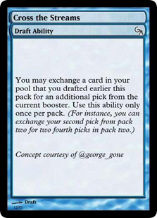 I’m pretty happy with where Cross the Streams ended up, and I’ve been trying to balance the other abilities against it. My only complaint is that the present wording is a little bit hard to parse (one of the drafters missed that the card you put back has to be from the current pack). Luckily, the extra room on the new layout makes clarification easy:
