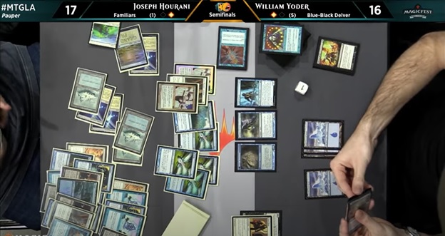Then, in March 2019, Familiars made one heck of a spectacle at the first ever Pauper Mythic Championship Qualifier at MagicFest Los Angeles when Joseph Hourani took it to the finals! If you want to see how it looks when it really goes off, you'll certainly want to check out his semifinal match. And if you can't watch that, well, have a look at this screenshot from the end of Game 3: