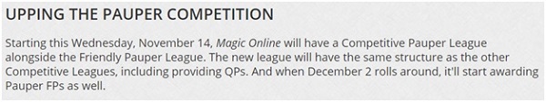 Yup, you're reading that right. Competitive Pauper Leagues are now on Magic Online. This is a huge game changer for the format and in a way, Magic at large. Up until now, we've largely had to rely on staple formats like Standard, Modern, Limited, and, once in a blue moon, Legacy to be able to qualify for the Pro Tour. That's all changing with the new way Wizards is structuring competitive play online, which you can read about here. Now you can get there by playing formats like Pauper and Vintage as well!