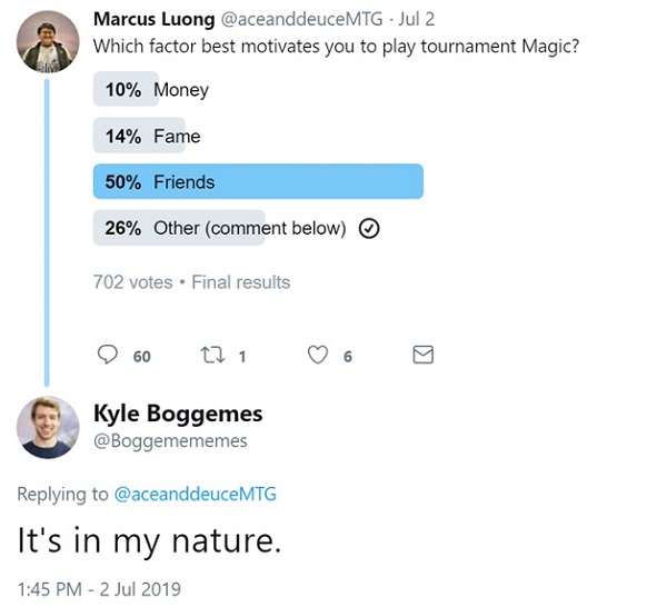 If you ask any veteran of tournament Magic they will say people are the most important aspect. It was a whopping 50% of the poll shown above. The friends I've made over my eighteen year Magic career is most certainly great. This is what makes team tournaments special to me. It's not the money, because the top 8 teams only walk away with $300 each. We're battling it out for the good times and the Twitter clout.