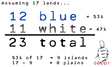 However, let’s say they’re not. I count 1 mana symbol of any color as "1" and any additional mana symbol on that card as a ½. If you have a multicolored card, you judge the same way GW = 1 forest + 1 plains. If 12 of your 23 cards are blue and 11 are white (with single mana symbols on each card) then you simply go 9 islands 8 plains.