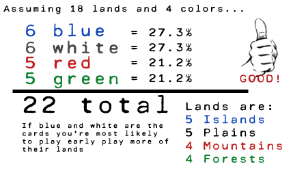 Let’s say though you’re running 4 different colors of equal presence. Then, I’d run 22 cards and 18 lands and split 18 lands equally but high on the 2 “cheapest” colors. Meaning if your blue and white spells are the cheapest overall, then play +1 for both Plains and Islands.