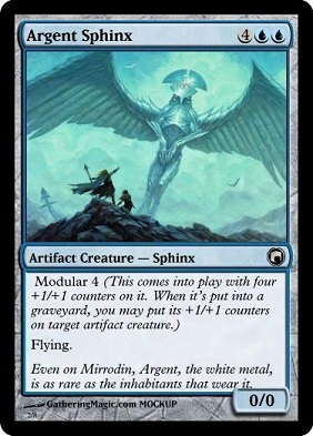 Speaking of Modular, a Darksteel mechanic that has returned, like Lazarus Man, from the graveyard of expansion-specific abilities. While unlikely to replace power house Modular creatures like Arcbound Ravager, there are still many creative ways to use +1/+1 counters. Speaking of returning themes, Argent Sphinx is also a colored artifact, from the Esper mold. Noteworthy, as a representative of the previous two attributes. Not to mention, on it's own, a 4/4 flyer for six mana is not a terrible deal. Argent Sphinx is playable in Sealed, even with the help of Robert Ulrich.