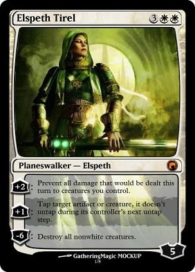 Feel the cosmos tremble, for I have pulled a foil Mythic Planeswalker named Elspeth Tirel, an advanced version of the popular Shards of Alara heroine. Of course the ultimate ability catches the eye first (it's only natural we want to see the true power of our Planeswalkers), but unfortunately it doesn't work well with the cards already revealed. Not to worry, because the +1 ability makes the evolutionary Elspeth a mighty weapon in any case. Also, a Dolmen Gate type effect for +2 makes ET's loyalty easy to get out of hand. Finally, if worse comes to worst, the final ability can act as a Day of Judgment. But enough loitering on this beauty, time to move on to the next booster...