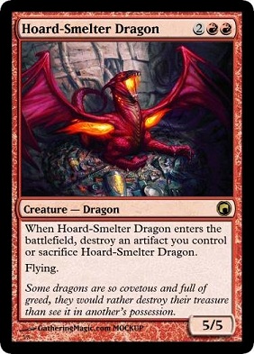 Well look at this, another handy use for my Darksteel Axe, a way to power out a 5/5 dragon on my fourth turn. That would probably be good enough to win any game it happened to occur. From a design respect, Hoard-Smelter Dragon is from a long lineage of high power, low cost creatures with drawbacks involved in getting them on the battlefield (Most recently in M11 with Phylactery Lich). Normally creatures that require a special extra cost can be troublesome in Limited events, but with a prevalent artifact theme going on, sticking this nasty shouldn't be too difficult.
