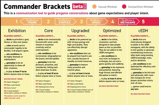 Instead of using a scale from one through ten, the numbers were consolidated into Brackets one through five. Bracket 1 contains the weakest decks, while Bracket 5 is reserved for cEDH tournament-level decks.