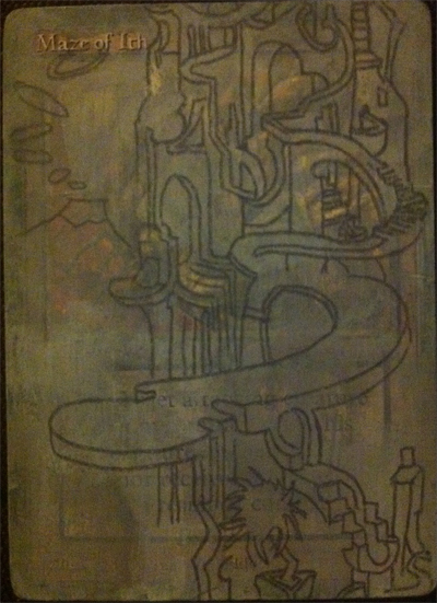After I had coated Andrew’s card early one evening, the itch to paint hadn’t subsided in the least, so I pulled out the brutalized Maze of Iths I had in the docket for months, and I started splashing orange, green, grey, white, peach, and many combinations of those all over the card. I’ll rewind a moment and show you what Ben Boccio sent to me.