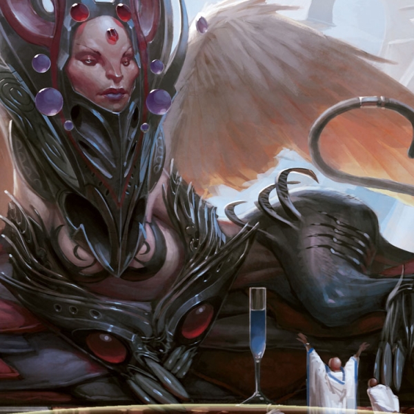 Flash-forward to the present day. I was looking at Sharuum (leader of one of our “jerk” Commander decks) and realized she has what appears to be some kind of champagne cocktail in front of her upon her royal dais. Suddenly I realized there must be other pieces of art in Magic’s long history that feature mixed drinks, and also that many of the skills valued and honed in Magic are applicable to professional bartending.
