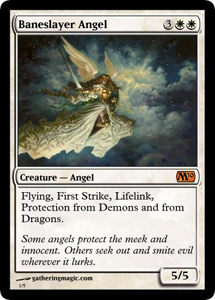 5 - Baneslayer Angel - If you assume that each ability on a creature should cost about one mana, this would be the best creature ever printed raw numbers wise. Around the net I've even heard some denying the recent spoiler leak because this card looks so powerful. And it is. Serra Angel is done for good. Simply unplayable in constructed while this Angel rules the roost. In most circumstances.. this card reads "you'll take 5 damage and I'll gain 5 life every turn." Because who is going to block this thing? You'll need something with six P/T and half of those creatures are demons or dragons. You're going to have to resort to removal. And any time you can force an opponent to deal with your card, you're doing something right. Some have speculated that Magic is experiencing "power creep" where each set the cards get more and more powerful and difficult to obtain until not only are old cards unusable but the game becomes a ridiculous three turn affair. I would argue that the ability of First Strike and the Protections only come into play in the off chance that someone decides to block this guy. It might as well read "unblockable" for how ofter that will happen. Flying and Lifelink are effective and make this card great. The other two are just bonuses and are part of what bumps her up to mythic. In the end, shes just a creature who must be dealt with. Use Oblivion Ring, Doom Blade, or even direct damage. Her unprecedented raw numbers are what earn her a place on my list of the Top 5 cards in Magic 2010.