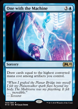 One With the Machine -- This is the Greenest Blue card ever printed. That said, there are a few decks with Darksteel Forge or Blightsteel Colossus that might get a kick out of resolving this.