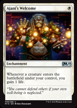 Ajani's Welcome -- I think this is a worthwhile card. Soul Warden effects have always been a powerful but narrow part of Commander and while this can't attack or block, it also can't die to a wrath.